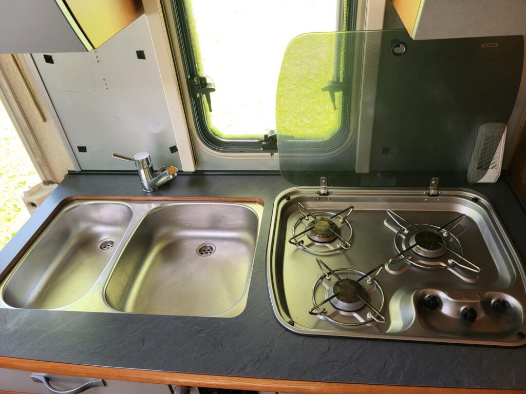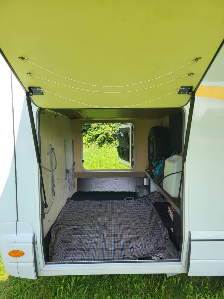 Leuke vrolijke striping wat de camper frisse en moderne looks geeft. Deze ruime camper biedt veel ruimte van binnen en ook in de garage.